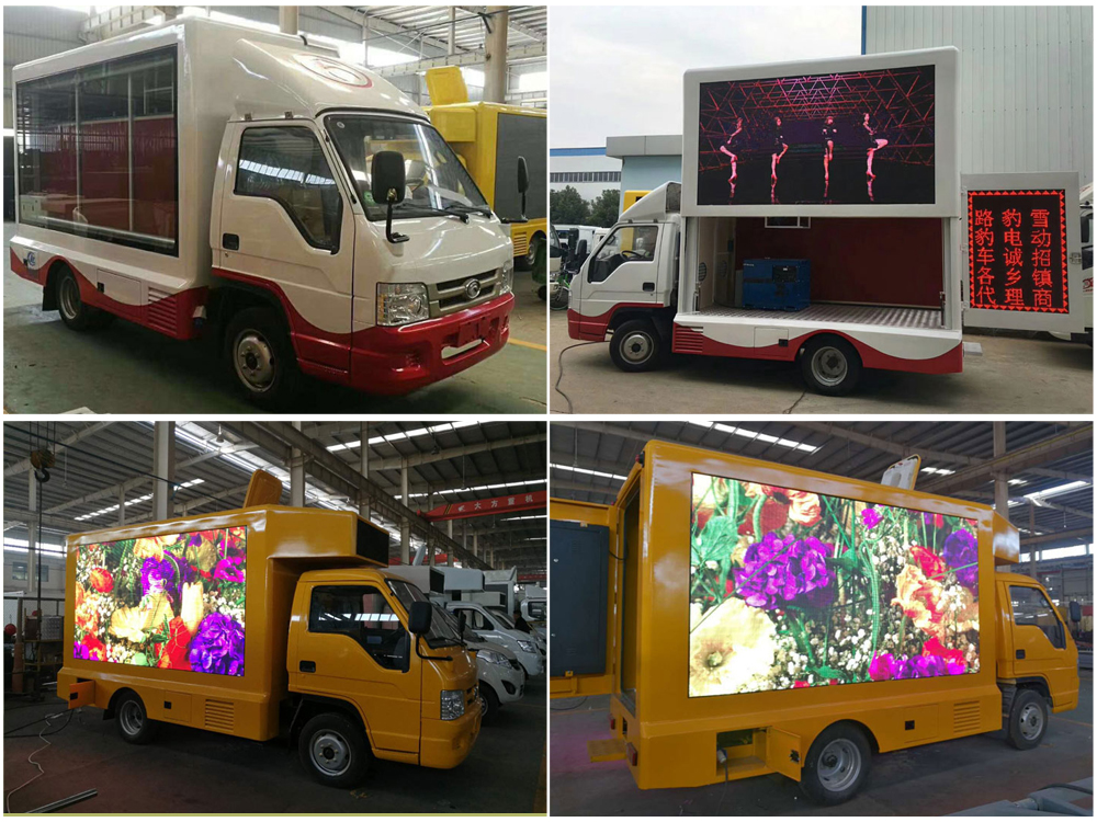 廣告車(chē)選裝配置:客戶可根據(jù)需求選裝屏幕清晰度(P10彩屏、P8彩屏、P6彩屏、P5彩屏、P4彩屏)、單面彩屏、雙面彩屏、雙面