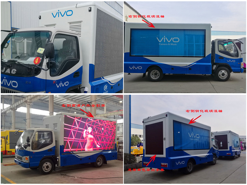 廣告車選裝配置:客戶可根據(jù)需求選裝屏幕清晰度(P10彩屏、P8彩屏、P6彩屏、P5彩屏、P4彩屏)、單面彩屏、雙面彩屏、雙面
